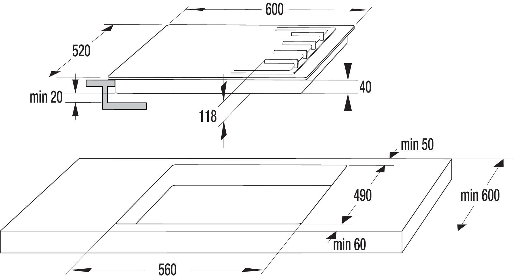 Gas hob | Dimensions (W×H×D): 60 × 13 × 52 cm | Protected gas burners