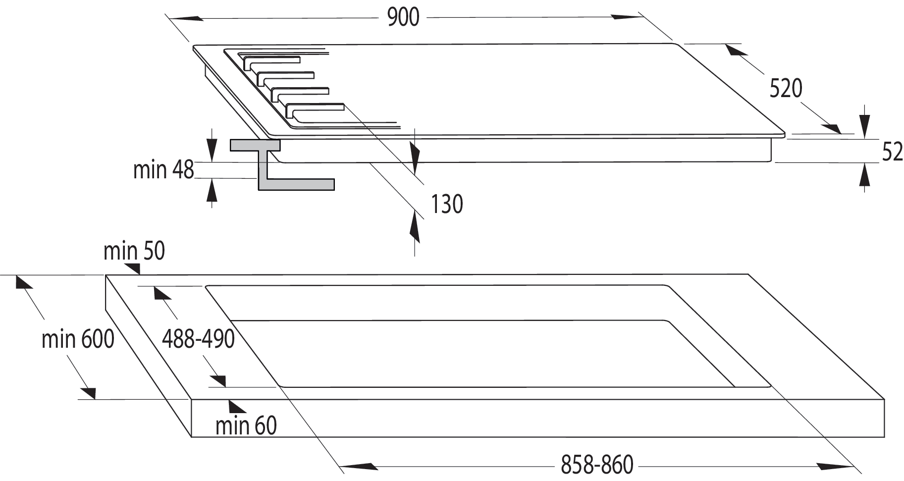 Gas hob | Dimensions (W×H×D): 90 × 13 × 52 cm | Protected gas burners