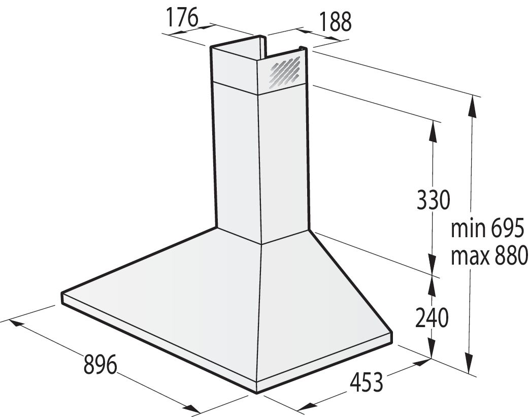 Product code: 745082 | Freestanding wall chimney cooker hood | Wall mounted cooker hood | Control setting: Button control | Max. noise level: 67 dB(A)re 1 pW | Maximum extraction rate by extraction operation: 695 m³/h | Energy class: A | Gorenje | Product line: G400 | Dimensions (W×H×D): 89.6 × 24 × 45.2 cm