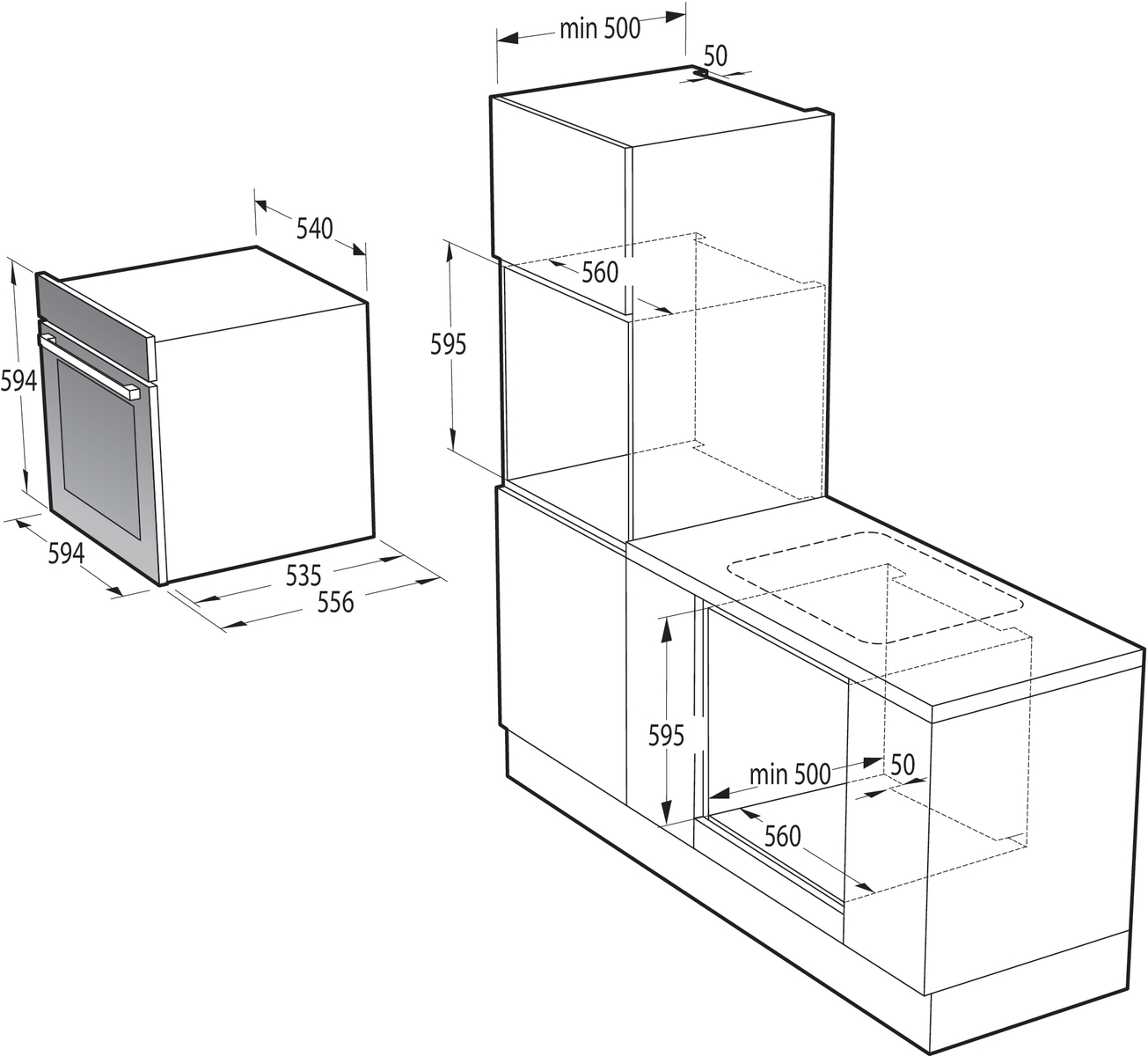 Electronic programming timer | Built-in single oven | Dimensions (W×H×D): 59.4 × 59.4 × 55.6 cm